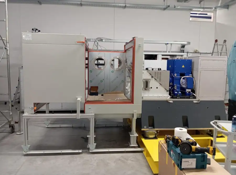 The configuration allows full access to the test chamber and reduces setup time compared to traditional climatic chambers.